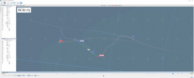 The second chart shows the speeds of the two AIM-7s. The envelopes are very similar, but the speed advantage of the Phantom’s Sparrow is extremely visible. In particular, it managed to reach and sustain the decent speed of M2.8 for 10s before slowing down. The effect of the Tomcat’s crank is visible as well in the missile speed-loss pattern.