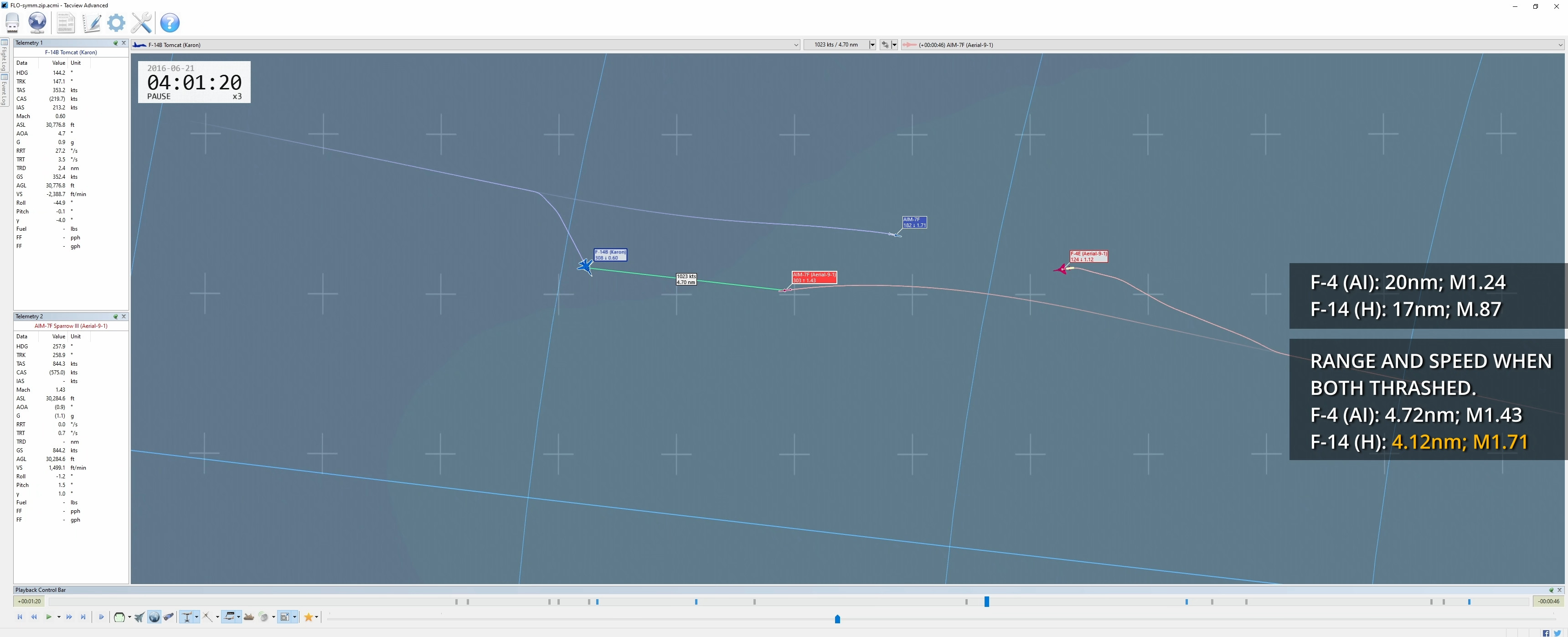 Something you may have missed is the distance and speed of each missile as they were thrashed simultaneously. The Phantom’s AIM-7 was at 4.72nm at a speed of M1.43. My Sparrow was at 4.12 and flying at M1.71. Not only was mine faster, but also closer when the Phantom defeated it. Let this sink in for a moment: I launched later and almost half a Mach slower, but my missile would have connected before the one launched earlier. After the data analysis, we will see more quick scenarios where I maintained higher speed, or where neither the Tomcat nor the Phantom defended.