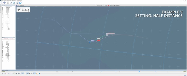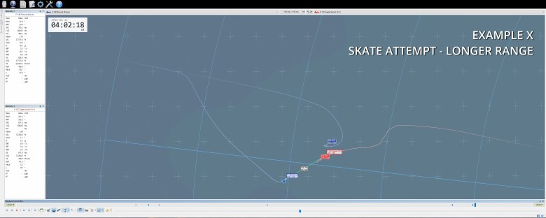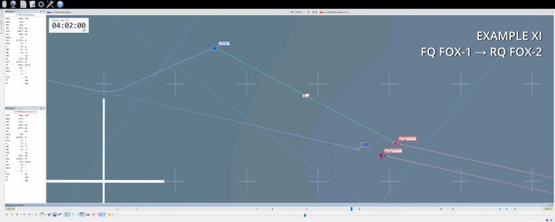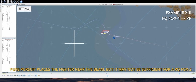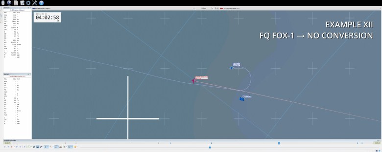 Let’s consider another example to highlight further the importance of the conversion against Pure Pursuit. In this case, I employed the AIM-7 as usual, but then I put the target on the nose, following a pure pursuit path. This may be acceptable for a further Sparrow shot, although Lead Collision or centring the ASE is better kinematics-wise, but it makes the usage of rear-quarter only AIM-9 quite an odd proposition. Moreover, if the targets can fight back and, for example, have a missile already in the air, this manoeuvre does them a favour.