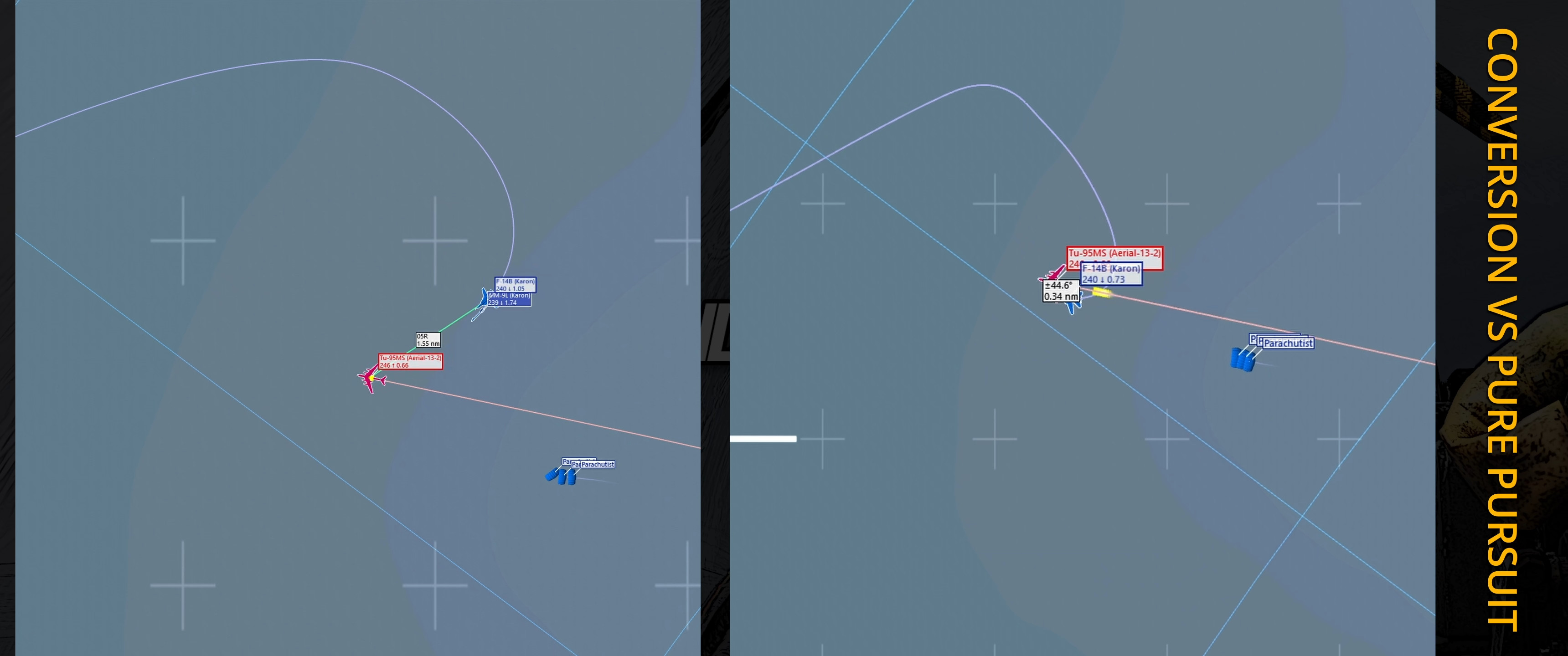 The scenario just explored shows the nature of the problem: without conversion, the fighter would launch its Sparrow and then find itself in an unsuitable position for the follow-up AIM-9. Alternatively, it would end up in a chase after the crank, thus out of the missile WEZ, or Weapon Employment Zone. Both cases are inefficient, as they cost time, fuel, and throw away a potential positional advantage.