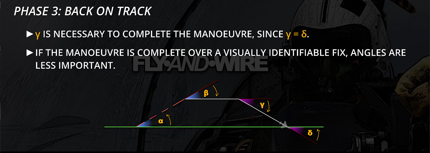 The turn towards the original track, in fact, equals the previous angle. The reason is intuitive: the aeroplane was flying parallel to the track, then the crew introduced a heading variation to return to the original plan, and now such an angle must be removed.