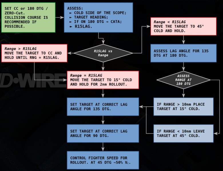 - Lastly, if R15LAG is greater than the range, the fighter needs room to manoeuvre, and the target should be placed at 45° cold and held there whilst the next oddity is computed. The idea is to anticipate the lag angle at 135 DTG. To do that, we check the range at 180 DTG. During the turn, in fact, the target likely has passed through the 180 DTG. That’s when the range is evaluated and ad hoc action is performed to further hold 45° cold, or place the target to 15° cold. The effect is to have the stick monkey janking the stick all over the place, but this is expected. However, as we will see in the third practical example, if the flow becomes too overwhelming, which is likely when flying without a human pilot or WSO, holding 45° cold until 135 DTG still works, with the caveat that 90 DTG will come up quicker than expected and the overall trajectory will be larger and rounder.