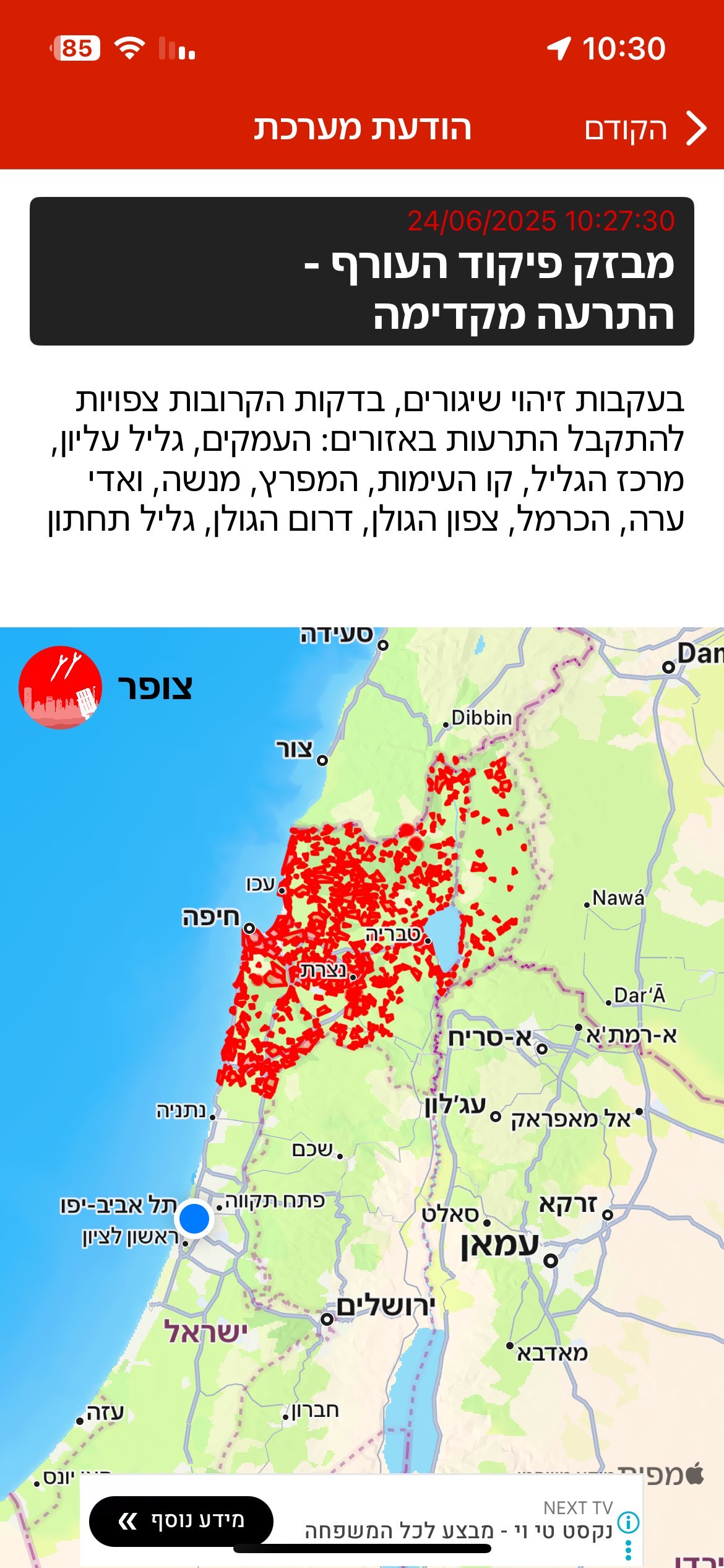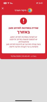 “Homefront alert (via an app) to stay close to a shelter until further notice due to an expected threat. This one is the one we got on Jun-13th, 3:40am, shortly after the sirens outside first told us something very extraordinary was happening.”
