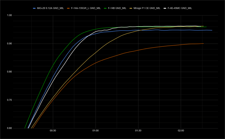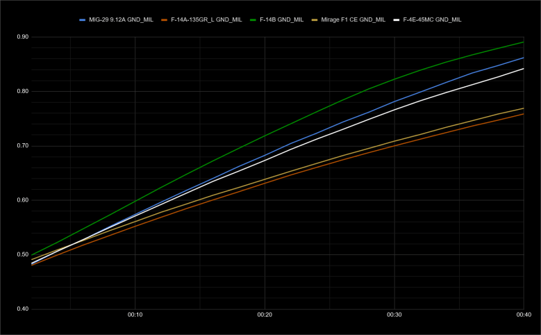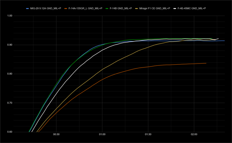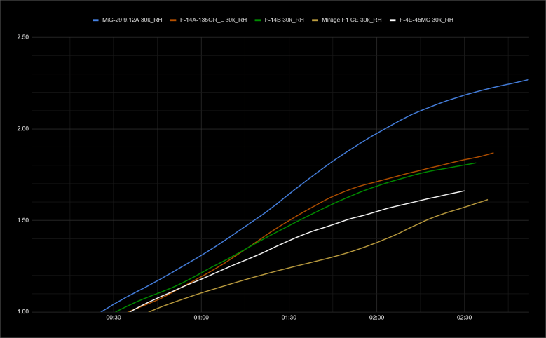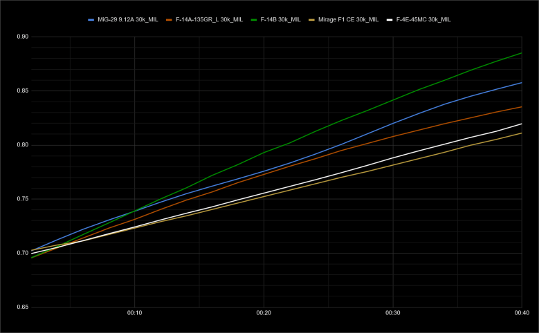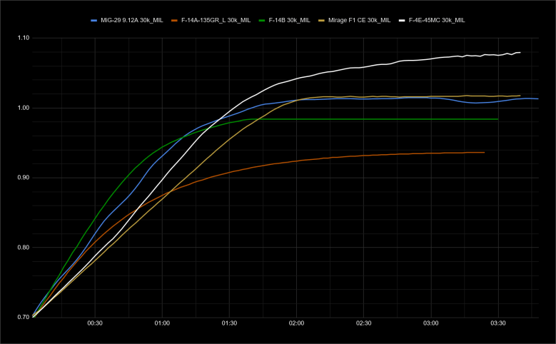 The Mirage F1 is an extremely fast aircraft, but its slightly underpowered engine does not particularly shine in terms of acceleration. Still, as the charts show, eventually the French aircraft can catch up, highlighting how careful energy management can offset the drawbacks of weaker engines.
