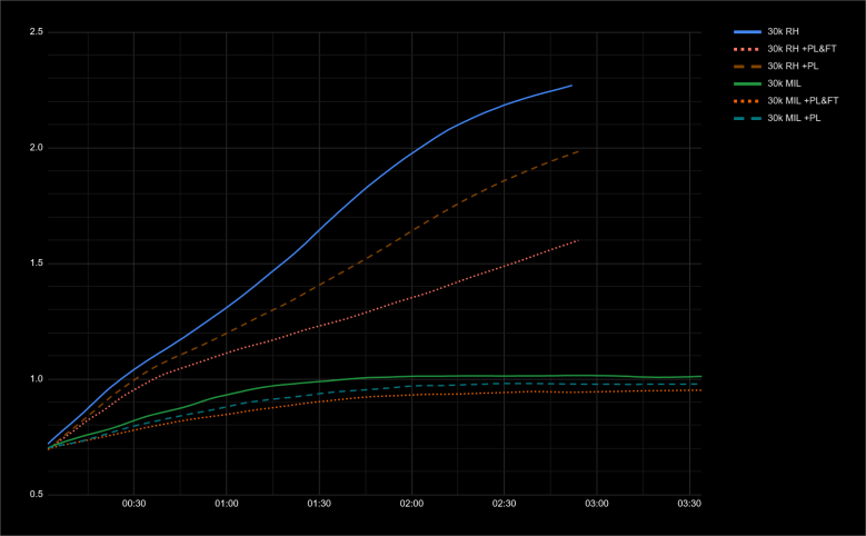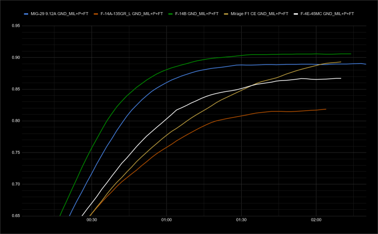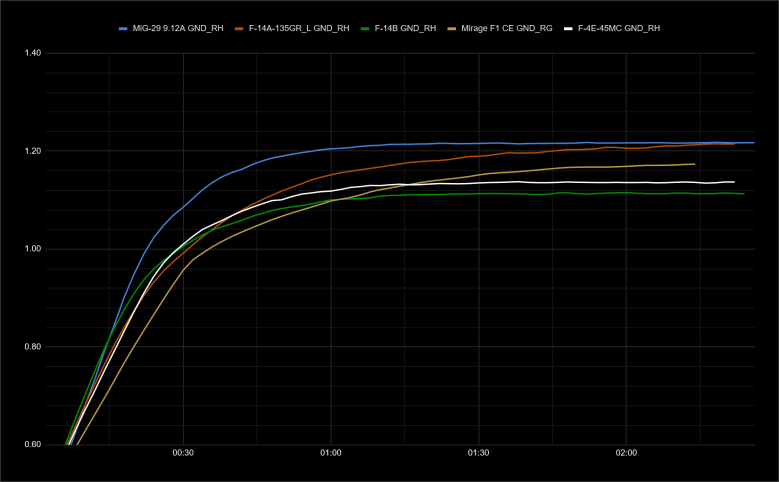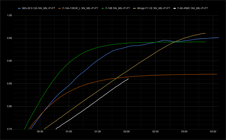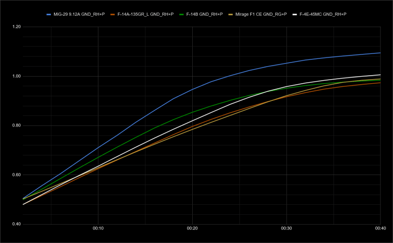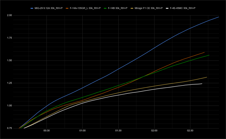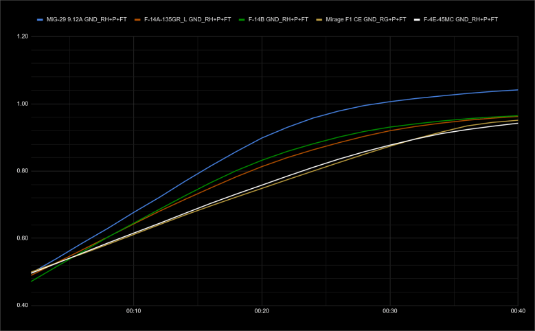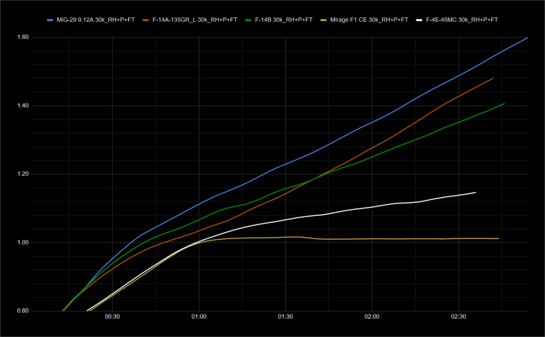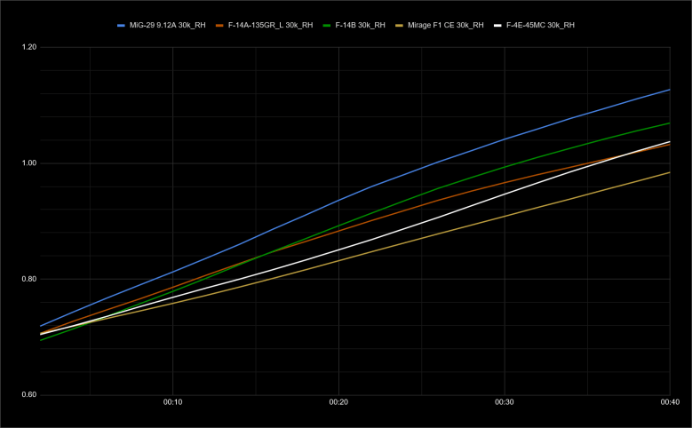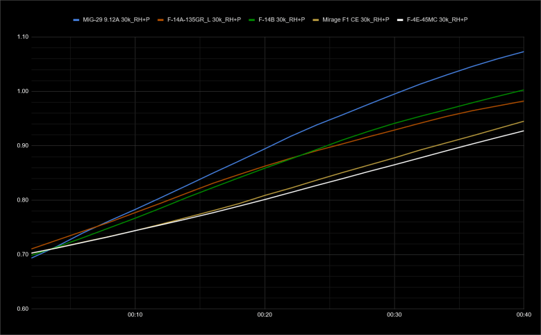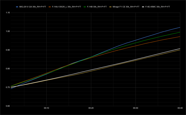 Back to the tests, these charts show how powerful the MiG-29 is. Its light ordnance makes it capable of outperforming anything DCS can throw at it with ease. In conjunction with its helmet-mounted system, the MiG-29 is an overwhelming threat at short range.