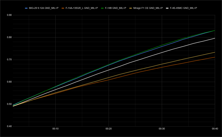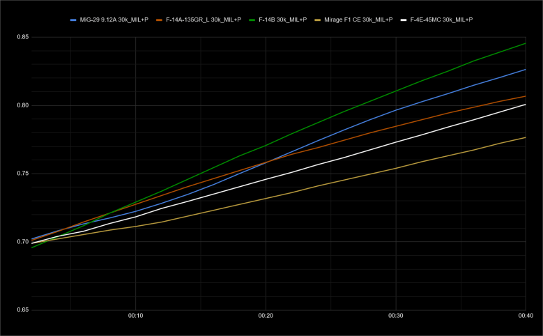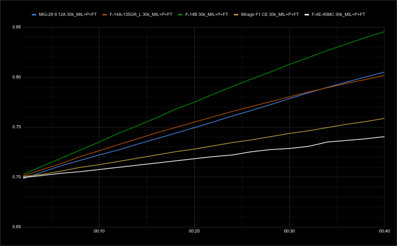 Back to the MiG, the performance of Tomcats and Fulcrum is quite comparable until M.8. The MiG’s slick characteristics allow it to cross the mentioned region without too many issues, and then maintain a marginal advantage across the envelope.