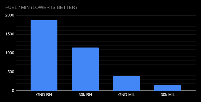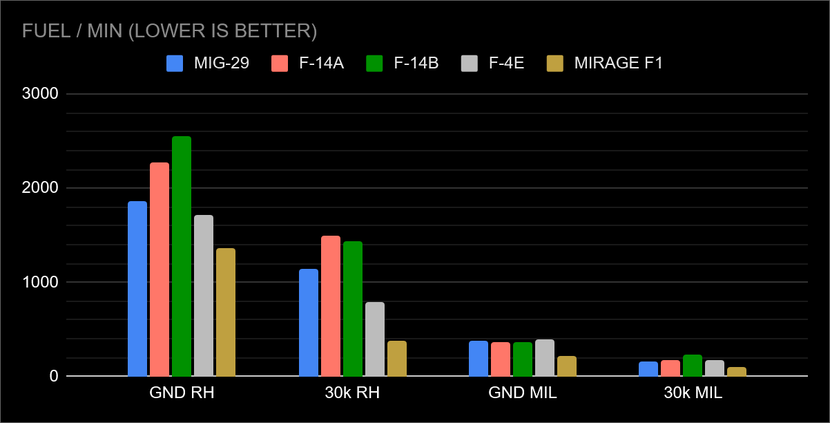 An even greater example of this is the F-14A. The fuel charts have shown how the pair of TF30 uses a quantity of fuel similar to the F110. However, the performance of the F-14B in terms of acceleration and without reheat blows away the F-14A. The Tomcat A may end up using the afterburner or military thrust setting more often than the B to achieve similar speeds, which nullifies the fuel consumption advantage.