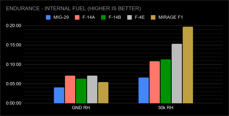 The MiG-29 is, once again, the worst performer. To reiterate, the engines are fine, but the Fulcrum carries low internal fuel and has two of them.