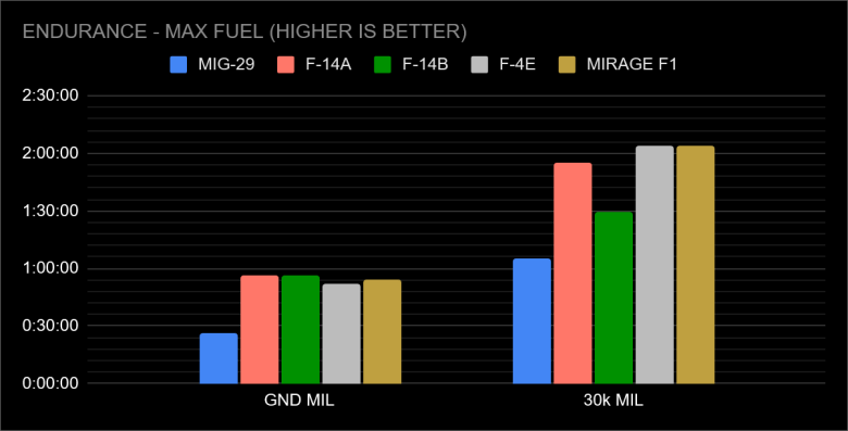 Moving to Military, the aeroplanes diverge further at ground level, where the Tomcats run away with a surprisingly high endurance. This characteristic is granted by their noticeable fuel capacity, which is more than double the MiG’s and the Mirage’s, and it is even greater than the Phantom’s.
