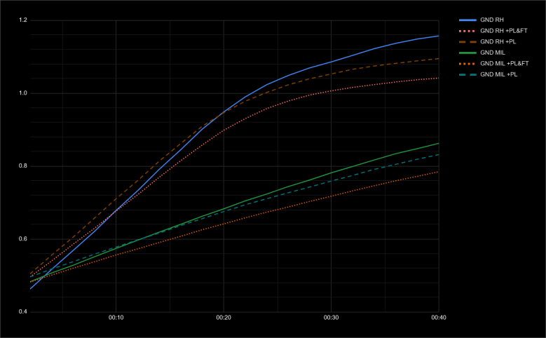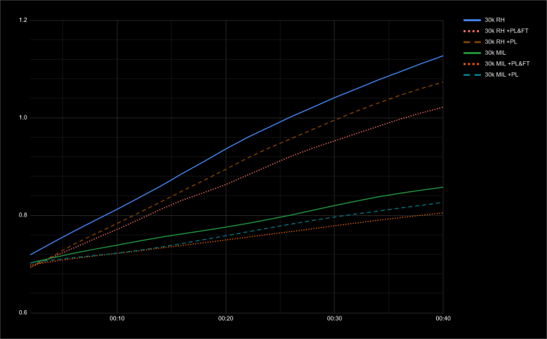 Since the charts would be unreadable due to the wide difference in terms of scale, I split them in Reheat and Military thrust regimes. Starting with the Reheat set, we notice how, at ground level, the usage of afterburners chokes the available flight time. The MiG-29 is indeed explosive, but it carries a quantity of fuel comparable to the Mirage F1, with the non-marginal caveat that the French design has only one engine.