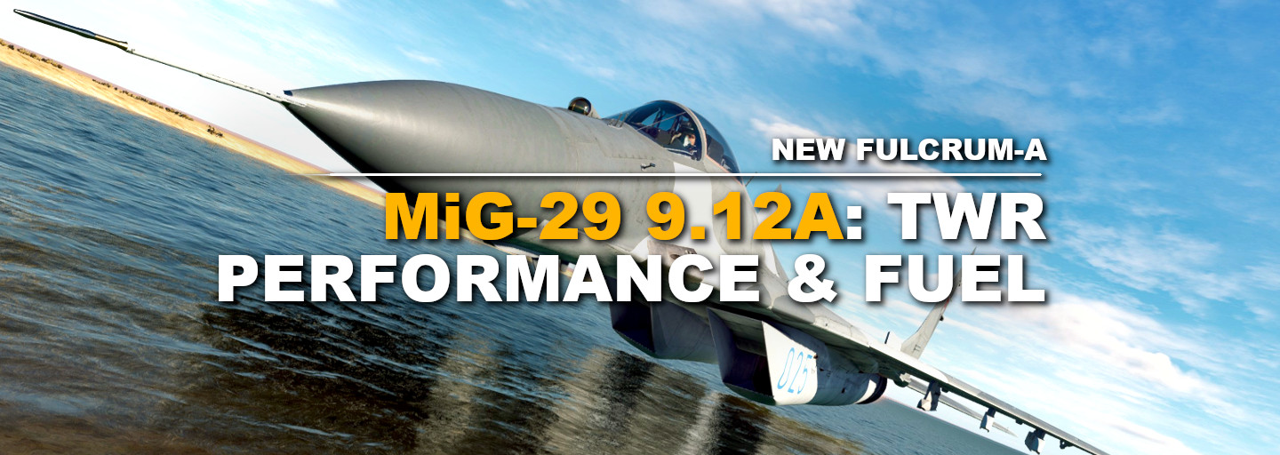 The MiG-29 9.12A is powered by a pair of Klimov RD-33, capable of generating a thrust of 100 kN dry, and circa 160 when reheat is applied. At the weight of just 11,000 kg, this gives the MiG-29 an astonishing thrust-to-weight ratio of 1.5 empty, 1.16 with internal fuel, and 1 with a typical DCS loadout. As a quick comparison, the F-14A-135-GR, powered by two underpowered Pratt & Whitney TF30, results close to thrust-to-weight ratio parity only when empty. The TF30s provide circa the same thrust as the Klimovs. The problem is that the Tomcat weight almost twice the MiG-29, at 19,000 kg.